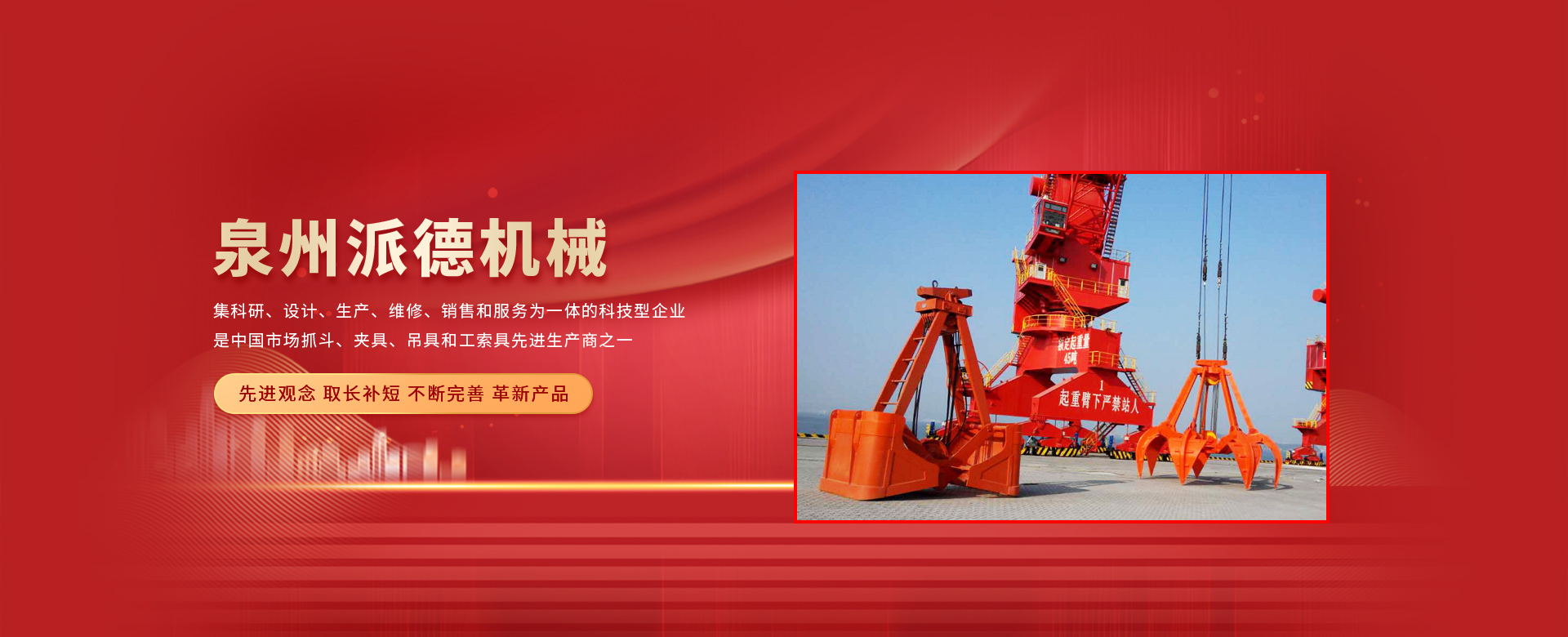 泉州派德機械有限公司成立于2012年5月,位于全國文明的古城福建泉州,公司擁有各類型專業(yè)員工82人,其中高級工程師1人,工程師4人,助理工程師5人,是一家集科研、設(shè)計、生產(chǎn)、維修、銷售和服務(wù)為一體的科技型企業(yè),是中國市場抓斗、夾具、吊具和工索具先進生產(chǎn)商之一。產(chǎn)品采用國內(nèi)外先進的設(shè)計方案、技術(shù)規(guī)范、制造過程、工藝流程和服務(wù),憑借在抓斗、夾具、吊具和工索具領(lǐng)域的超前設(shè)計理念和成熟的技術(shù)、工藝和管理,在抓具領(lǐng)域迅速崛起。